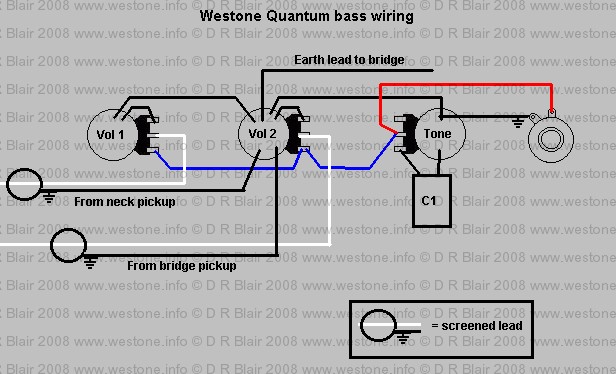 This wiring diagram is taken from a 1984 Quantum bass. The pots are all 250K log/audio, the tone capacitor is 0.047 microfarad Mylar.